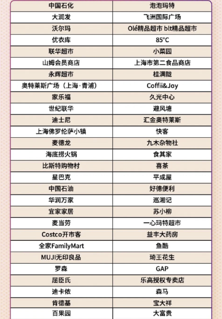 热门线下商户中,除了全家、好德、麦德龙、开市客、大润发、联华超市等商超便利店,以及星巴克、麦当劳、大富贵、红宝石、顺风大酒店等餐饮类企业,也给我们提供了不少新的思路。