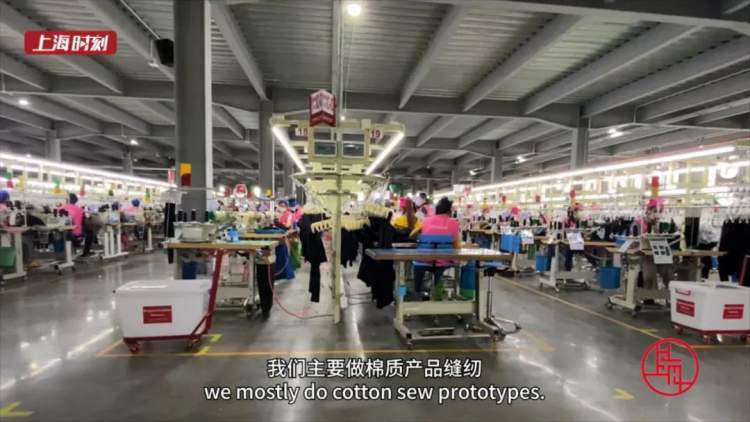 正值生产旺季,元泰柬埔寨工厂的生产车间里一片忙碌,数百台纺织机高速运转,工人们全神贯注地缝制、熨烫、包装着崭新的衣物。风风火火的特蕾西穿行在不同的操作区域,有时停下来看一看进度,有时摸一摸刚缝好的针脚,微笑着和员工们打招呼。