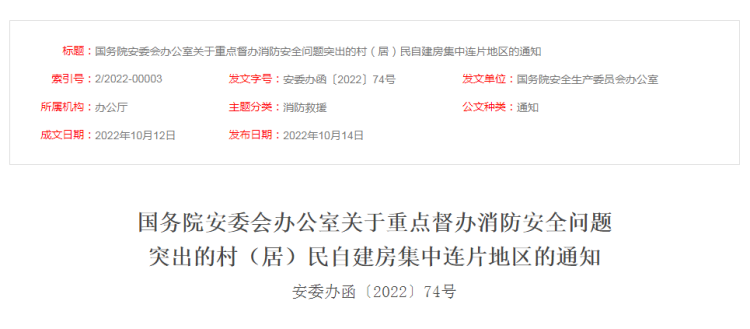 据应急管理部网站消息,日前,国务院安委会办公室发布关于重点督办消防安全问题突出的村(居)民自建房集中连片地区的通知。