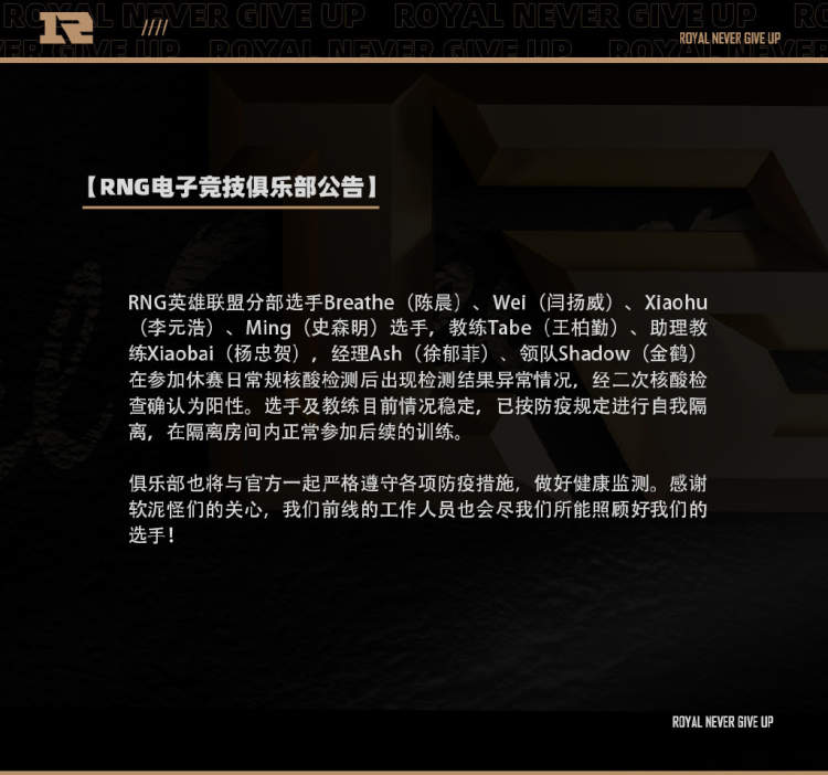 据@RNG电子竞技俱乐部,RNG英雄联盟分部选手Breathe(陈晨)、Wei(闫扬威)、小虎(李元浩)、Ming(史森明)选手,教练Tabe(王柏勤)、助理教练小白(杨忠贺),经理Ash(徐郁菲)、领队Shadow(金鹤)在参加休赛日常规核酸检测后出现检测结果异常情况,经二次核酸检查确认为阳性。
