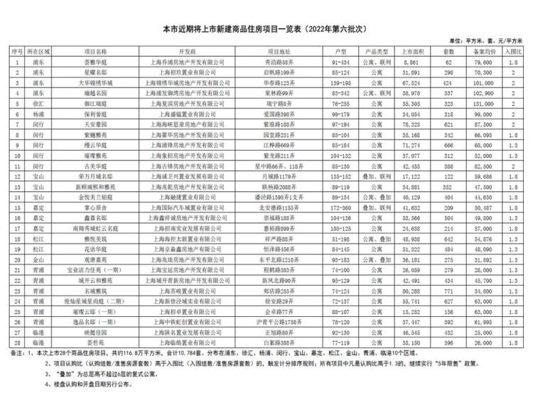 今日,上海2022年6批次新房名单公布,本次入市28个新盘,合计10784套房源,总面积约116.8万平方米,备案均价约61834元/平方米,分布在徐汇、杨浦、浦东、青浦、闵行、嘉定、松江、宝山、金山、临港10个区域,黄浦、长宁、静安、普陀、虹口、奉贤、崇明没有供应。