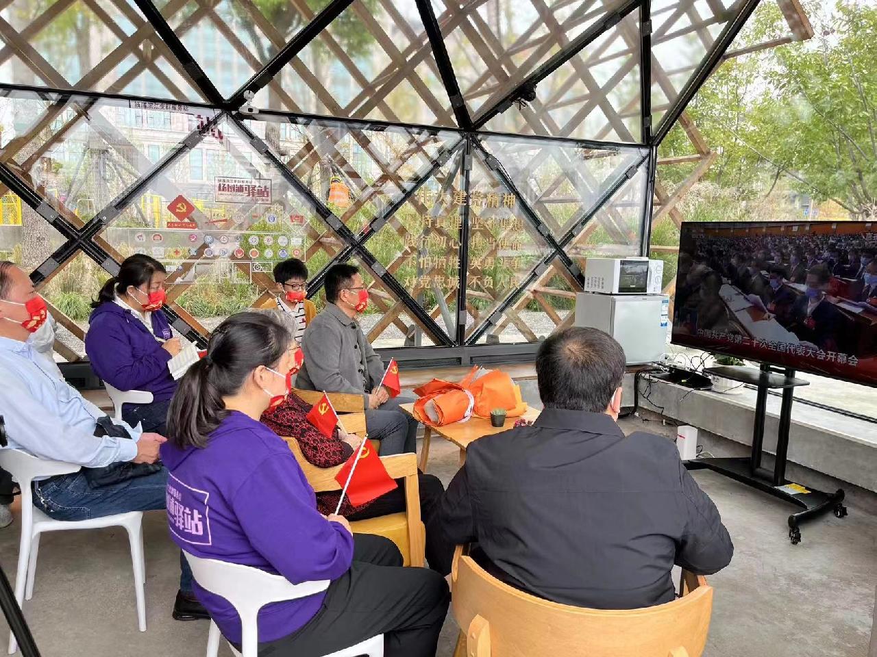 10月16日上午,在杨浦滨江人人屋党群服务站,“七一勋章”获得者黄宝妹,部分滨江建设者代表、社区工作者代表,与人人屋党群服务站志愿者和过路的市民们一起,集中观看了党的二十大开幕会,认真聆听,感受团结、奋进的时代脉动。