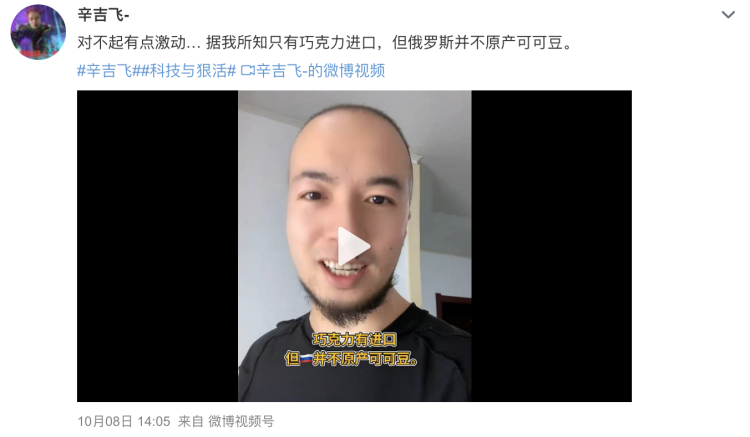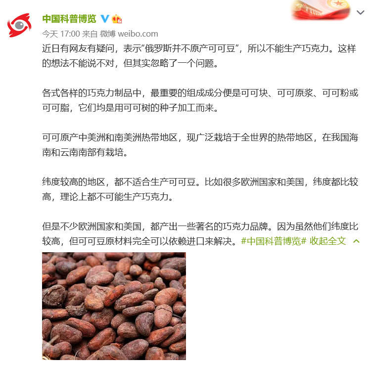 对此,中国科普博览在微博发表回应称,虽然可可只能在全世界的热带地区栽培,但是“可可豆原材料完全可以依赖进口来解决”。