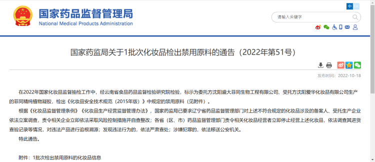 18日国家药监局发布1批次化妆品检出禁用原料的通告,通告如下:在2022年国家化妆品监督抽检工作中,经云南省食品药品监督检验研究院检验,标示为委托方沈阳盛大菲同生物工程有限公司、受托方沈阳爱华化妆品有限公司生产的菲同精纯植物凝胶,检出《化妆品安全技术规范(2015年版)》中规定的禁用原料。
