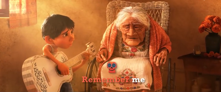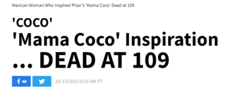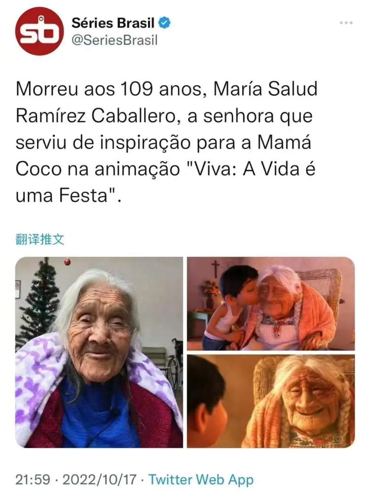 可可是米格的太奶奶,是亡灵界与人间的连接点。在她很小的时候,父亲就不在了,虽然她现在年纪大了有些神志不清,但是依然没有忘记父亲。电影中,米格为了唤醒太奶奶的记忆,弹唱歌曲《Remember Me》的画面,非常感人。现实中,老奶奶和片中的角色一样,梳着可爱的麻花辫。
