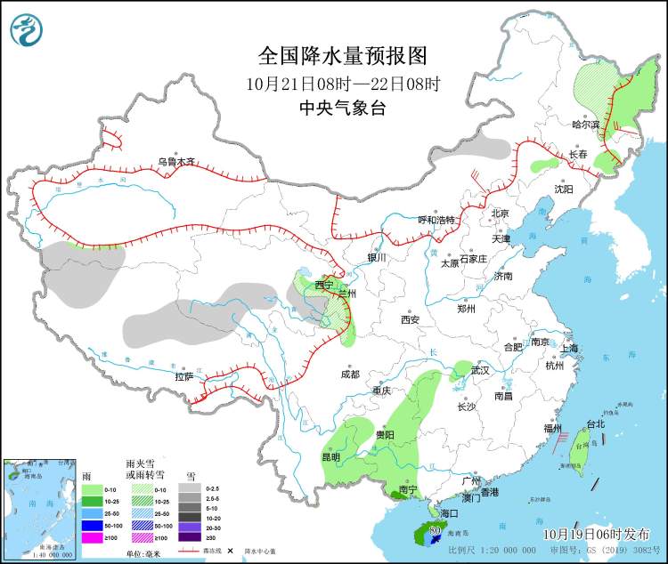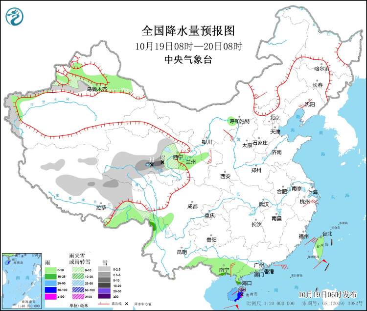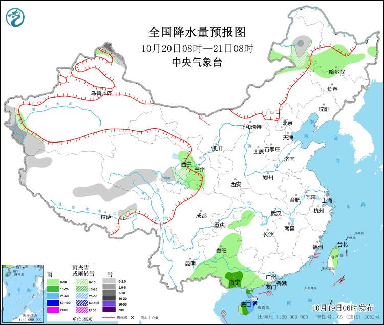 10月19日08时至20日08时,新疆沿天山地区和南疆西部山区、西藏中北部、青海东部和中南部等地的部分地区有小到中雪或雨夹雪,其中,青海南部等地局部地区有大到暴雪(10~12毫米)。海南岛、雷州半岛、广西南部等地有中到大雨,其中,海南岛东部和南部的局部地区有暴雨或大暴雨(100~110毫米)(见图2)。