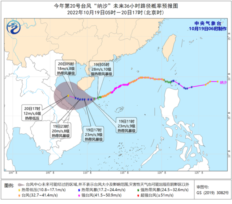 预计,“纳沙”将以每小时15-20公里的速度向偏西方向移动,强度逐渐减弱,今天白天从海南岛南部海面掠过,20日将在北部湾南部海面减弱消散(见图1)。19日08时至20日08时,受“纳沙”和冷空气共同影响,东海南部、台湾海峡、台湾以东洋面、巴士海峡、南海北部和中西部及西沙群岛附近海域、北部湾、琼州海峡以及浙江东南部沿海、福建沿海、台湾岛沿海、广东沿海、广西沿海、海南岛及沿海仍将有7-9级大风,其中“纳沙”中心经过的附近海域风力可达10级,阵风11-12级。19日08时至20日08时,海南岛大部将有大到暴雨,其中海南岛东南部将有大暴雨(100-110毫米)。