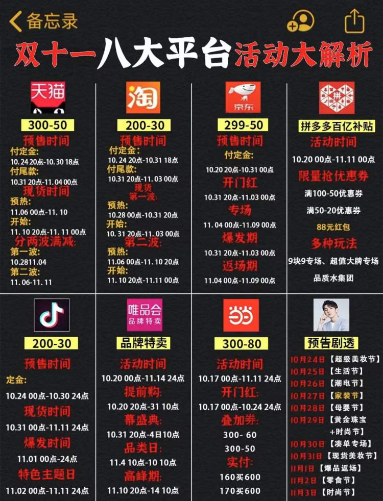 从网友总结的大促节点中我们可以看到,今年“双11”活动继续提前,不同平台支付定金的时间从10月20日至31日不等——