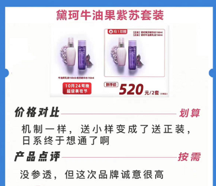 “虽然总价涨了50元,但赠品送了正装”,“去年用小样凑齐了正装的量,今年终于不用一小瓶一小瓶挤出来用了。”