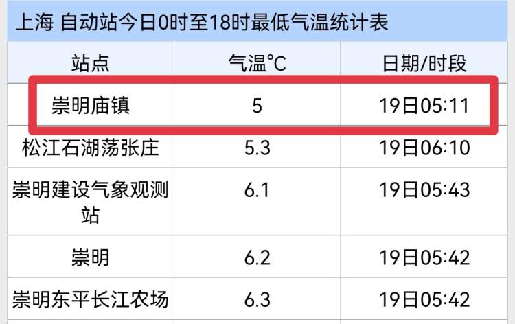 辐射降温的作用下,今天早晨崇明、金山、青浦、奉贤和嘉定等地最低气温又跌至个位数,最低的崇明庙镇自动站最低气温才5℃。
