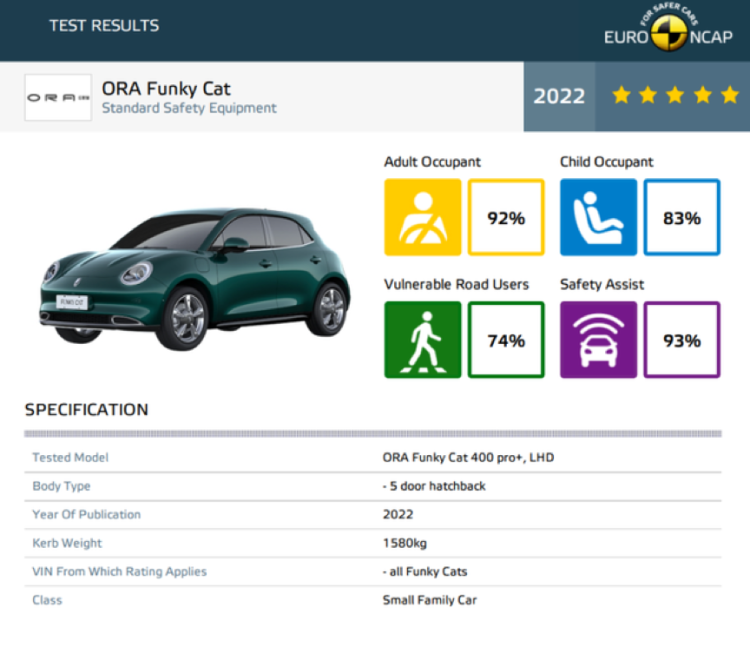 作为欧拉品牌的首款全球化车型,欧拉好猫在国内持续领跑15万级别A0级BEV市场,更以“高质高价”冲击海外高端汽车市场,先后出口泰国、英国,备受当地消费者认可。欧拉好猫搭载了实用的L2级驾驶辅助功能,集成ACC自适应巡航、前碰撞预警FCW、车道保持辅助以及360全景影像等功能。在今年9月初的欧洲NCAP最新测试中,欧拉好猫更是经受住严苛考验,以高分成绩领先国内外一众实力车型,获得E-NCAP五星安全认证。