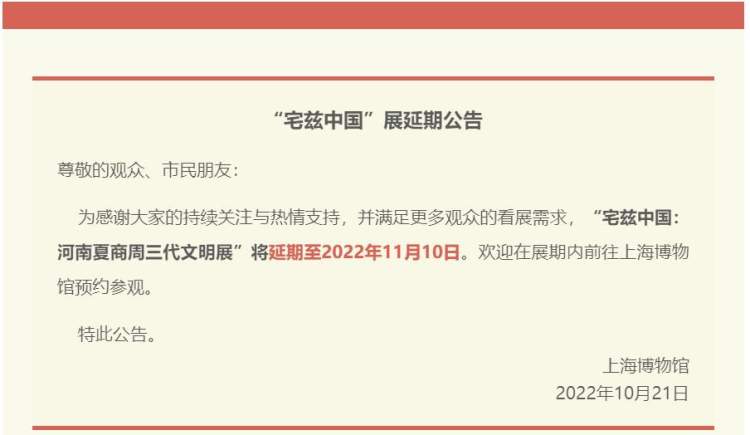 上博“宅兹中国”延展至11月10日! 周到君 2022-10-21 来源:周到上海 周到君刚从上海博物馆官微获悉,“宅兹中国”展延期至11月10日! 为感谢大家的持续关注与热情支持,并满足更多观众的看展需求,“宅兹中国:河南夏商周三代文明展”将延期至2022年11月10日。欢迎在展期内前往上海博物馆预约参观。 来源:周到上海 作者:周到君 赞一个 (0)
