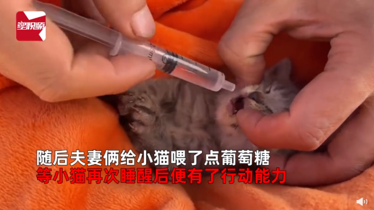 经过一个多小时的努力,小猫逐渐有了呼吸身体变软,夫妻俩给小猫喂了点葡萄糖,