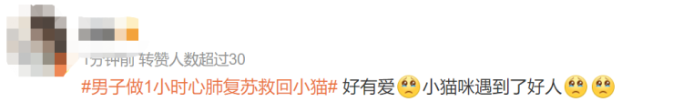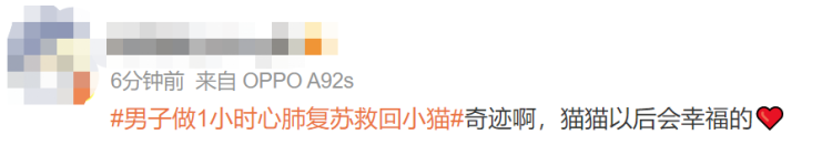 随后男子不断按压小猫做心肺复苏。该男子的妻子发现在施救过程中,小猫突然张了一下嘴,这让他们燃起了希望。