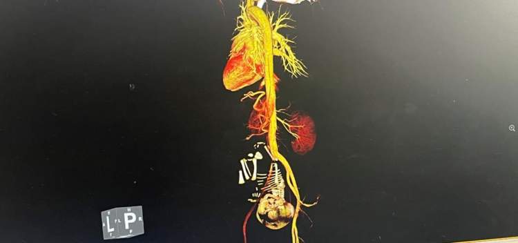 9月27日,新华医院妇产科、急诊科接到外院紧急转诊需求,一名突发剧烈腹痛且发生晕厥的孕妇即将经由上海市危重孕产妇会诊抢救绿色通道转来。急诊及产科医生立即安排CT血管造影检查以及超声检查,结果显示: