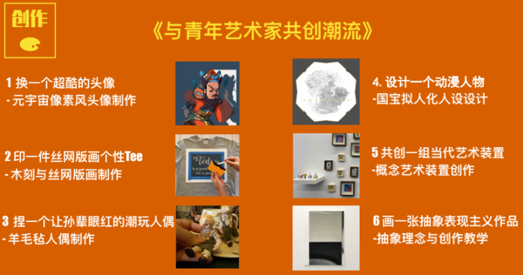 “艺术潮流类”课程邀请艺术界青年艺术家,开设“像素风头像创作”“丝网版画T恤制作”“国宝动漫人物设计”“概念艺术装置创作”等时下新潮的艺术课程。