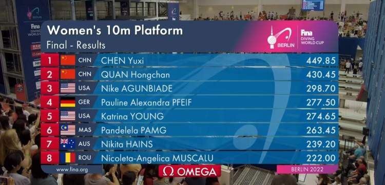 不过队友陈芋汐的状态相当好,她在第三跳完美上演水花消失术,得到4个10分,总分97.35分,从而在三跳过后上升到第一位。