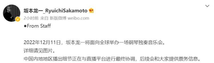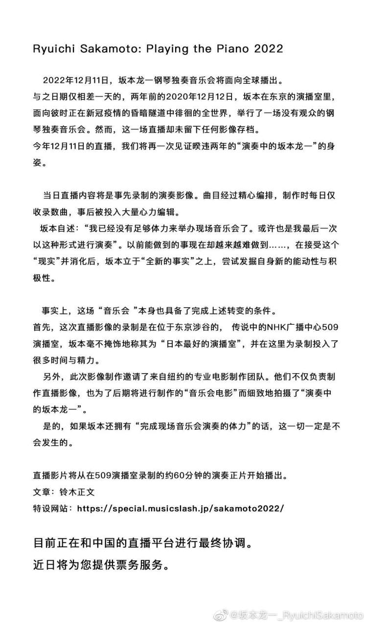 坂本龙一近况如何?周到君25日上午从其社交媒体了解到,2022年12月11日,身处癌症晚期的日本音乐家坂本龙一将面向全球举办一场钢琴独奏音乐会。中国内地地区播出细节正在与直播平台进行最终协调。