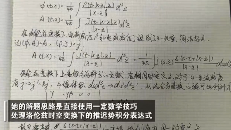 据悉,她的解题思路是直接使用一定数学技巧处理洛伦兹时空变换下的推迟势积分表达式。