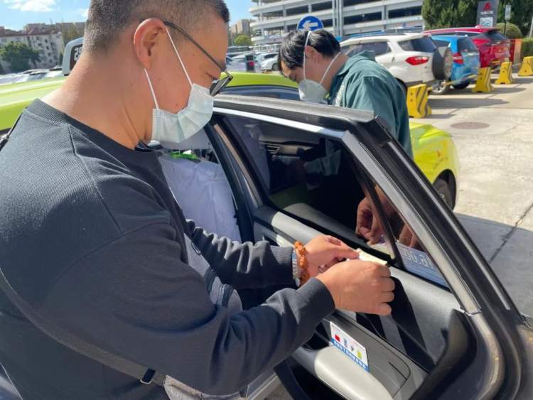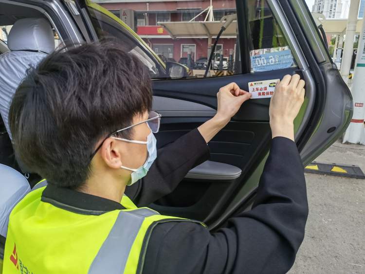 在服务站工作人员的指挥下,每一辆营运出租车和驾驶员都完成了消毒、贴标贴、检查、拍照登记、注意事项宣贯等一套完整流程,然后投入营运。目前,张贴工作还在紧锣密鼓进行中。