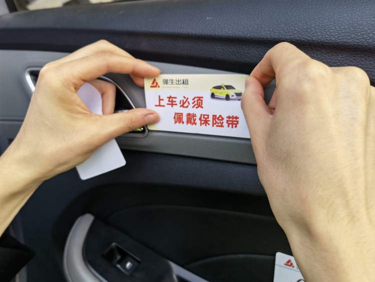 今天下午,在凯旋路虹桥路口,记者采访到一位刚刚从强生出租车上下车的市民。他告诉记者:“我每次乘坐出租车都喜欢坐后排,一向没有系保险带的习惯。今天从中山公园门口打的,一落座就听到了语音提醒,还发现了新标签,提醒要戴好保险带,后排车门的两侧都有,特别醒目。我赶紧系上了。“