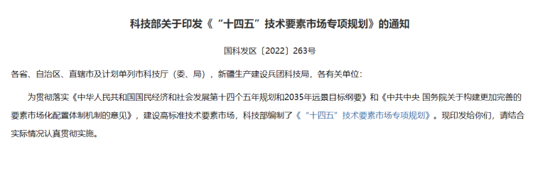 25日,科技部发布《“十四五”技术要素市场专项规划》。