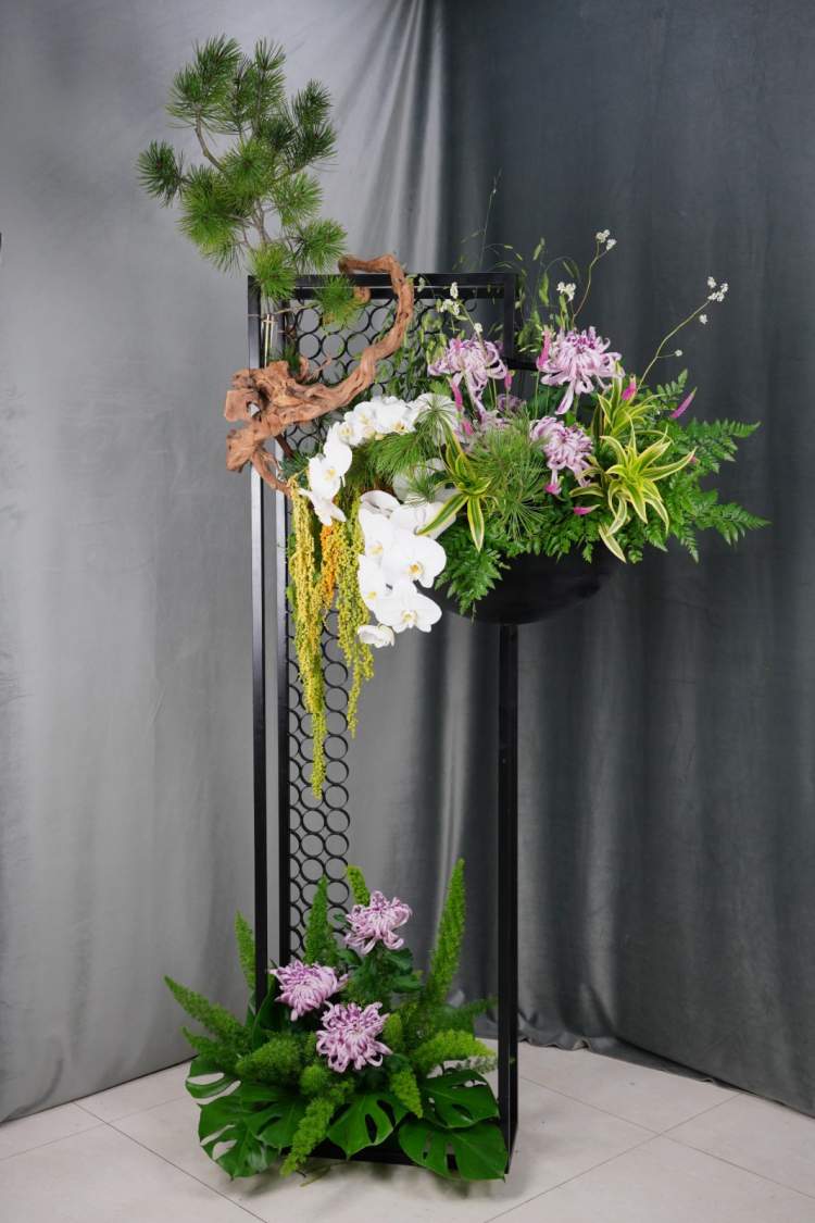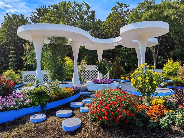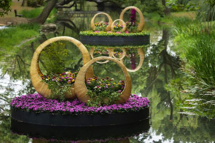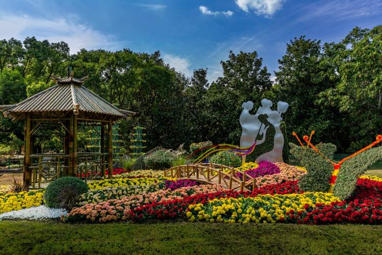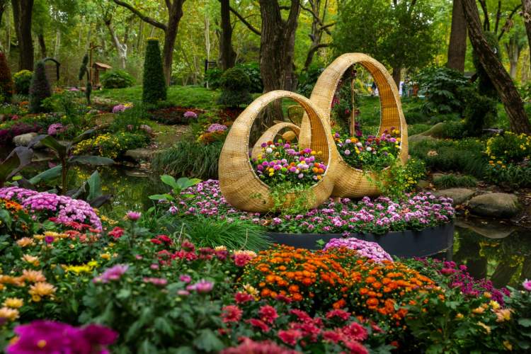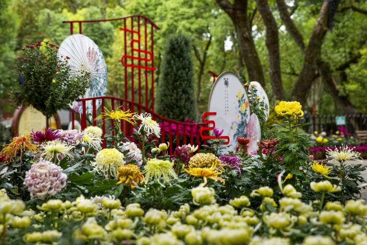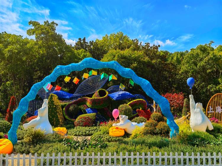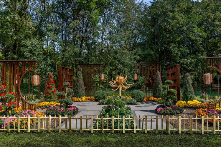 原花艺馆位置依托森林背景,布置了8组室外景点,以菊花为主要造型材料,采用立体绿雕、花境等形式,打造丰富多样的菊花景观。