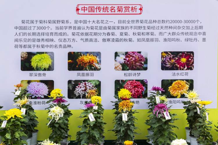 香樟广场区域采用精品菊花造景与科普文化相融合的布置方式,集中展示菊花品种与菊花文化的独特魅力。展示精品菊花约500个品种,包括来自全国各地的传统独本菊、多头菊、案头菊、切花菊以及国外进口新奇特小菊等。科普文化展示融合了菊花分类、菊花诗词、菊花绘画、菊花图谱等科普知识,阐释底蕴深厚的中华菊文化艺术。