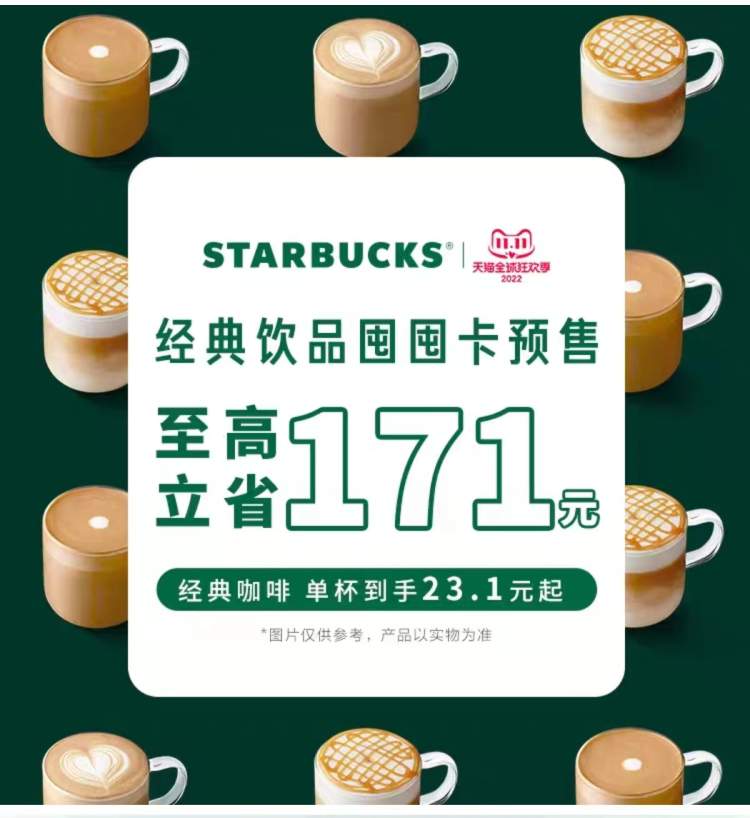 星巴克经典饮品囤囤卡预售,最高可省171元,比如,原价大杯33元的拿铁/燕麦咖啡,大杯15杯囤囤卡,降至平均23.1元/杯;原价大杯37元的焦糖玛奇朵,大杯15杯囤囤卡,降至平均26元/杯;原价大杯38元的馥芮白,大杯15杯囤囤卡,降至平均26.6元/杯等。