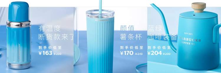 喜欢星巴克杯子的,近期也有85折限定新品预售:有温度断货款原价239元,到手价163元;颜值薯条杯原价249元,到手价170元;蓝绿咖啡装备原价299元,到手价204元等。