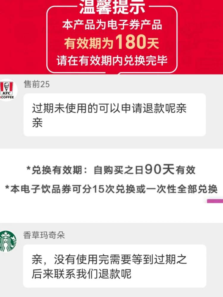 据悉,这些电子卡券有使用期限,比如肯德基的电子券需在180天内使用完毕,星巴克的囤囤卡有效期为90天,相当于每周都要吃一次才能用完。不过,消费者也不用担心过期问题,因为两家客服均表示,逾期未使用的部分可以按比例进行退款,因此不必有“买了必须要限期足额用完”的压力。