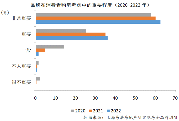 2022年消费端调研结果显示,品牌在消费者购房行为中起着重大的影响。2022年,在消费者对房企品牌重视程度方面,选择非常重要的达62.34%,较2021年上升2.51个百分点。选择重要的占比35.89%,较2021年上升1.11个百分点。选择一般的占比1.24%,不太重要的占比0.42%,很不重要的占比为0.11%,这几项均小于2021年的占比。总体看来,房企品牌成为消费者购房行为中越来越重要的考量因素。
