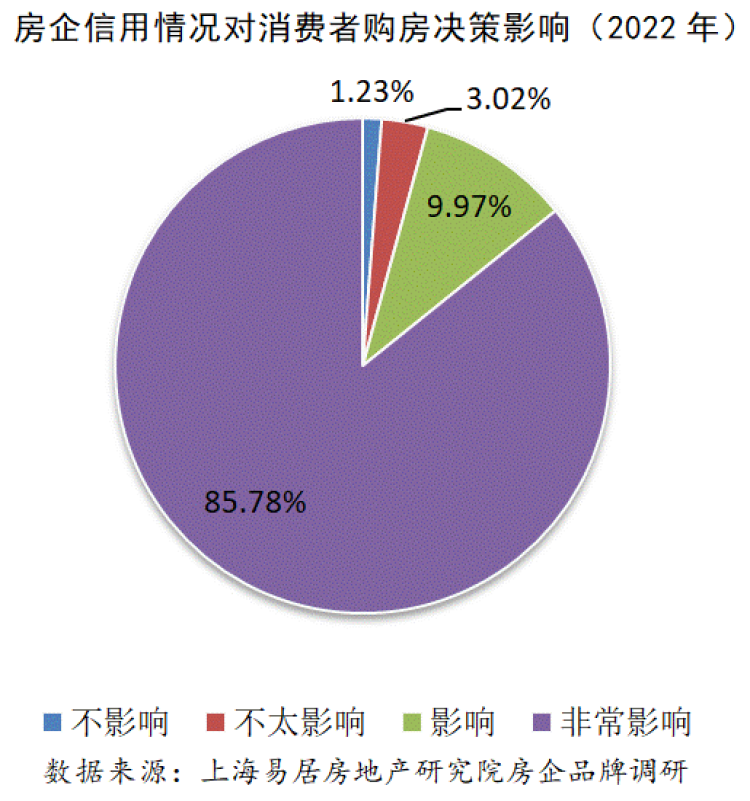 从2022年的消费者调研来看,由于部分房企出现交付困难等负面信息,房企的信用情况受到消费者越来越多的关注。在被问及如果开发商有债务违约等信用及财务风险情况,是否会影响购房决策时,85.78%的消费者认为非常影响,不影响和不太影响的占比仅为1.23%和3.02%。