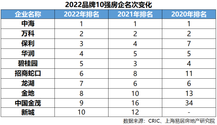 根据测评报告,榜单前三由中海、万科和保利占据。中海继续位列榜首,品牌价值为807亿元,万科、保利分别以758亿元和546亿元位列第二位和第三位。华润置地、碧桂园、招商蛇口、龙湖、金地、中国金茂和新城分列四到十位。报告显示,2022年50强品牌房企位次变动较大。其中,50强榜单变动率为50%,较上年大幅上升36个百分点;20强榜单变动率为40%,较上年上升30个百分点;10强榜单变动率为20%,与上年持平。