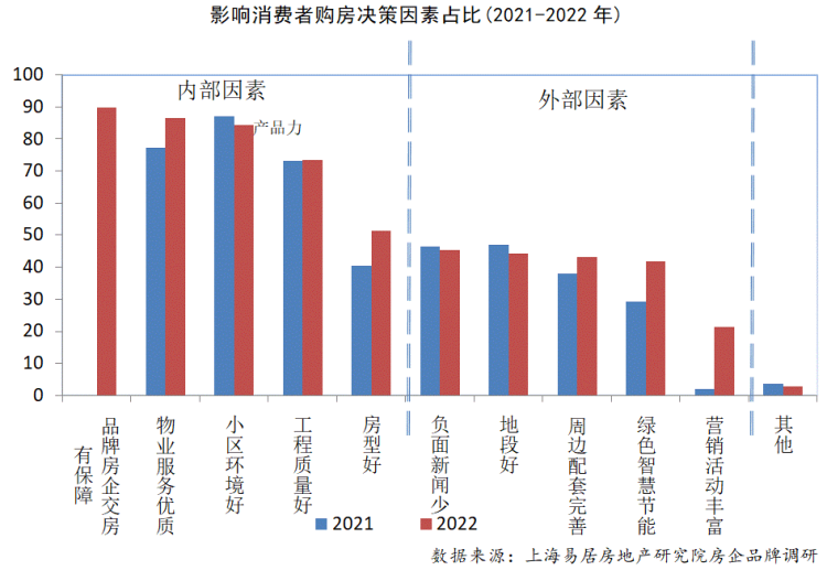 房企品牌调研结果显示,2022年,影响消费者购房决策因素中,最重要的因素是交房保障,其次是物业服务、小区环境和工程质量,占比分别为89.59%、84.37%、73.54%、51.23%。与2021年调研数据相比,受到部分房企项目交付困难的影响,交付是否有保障受到消费者最多关注。物业服务、小区环境同样是消费者重要考虑因素,说明除了产品属性外,房地产的服务属性越来越与消费者的居住体验相关。