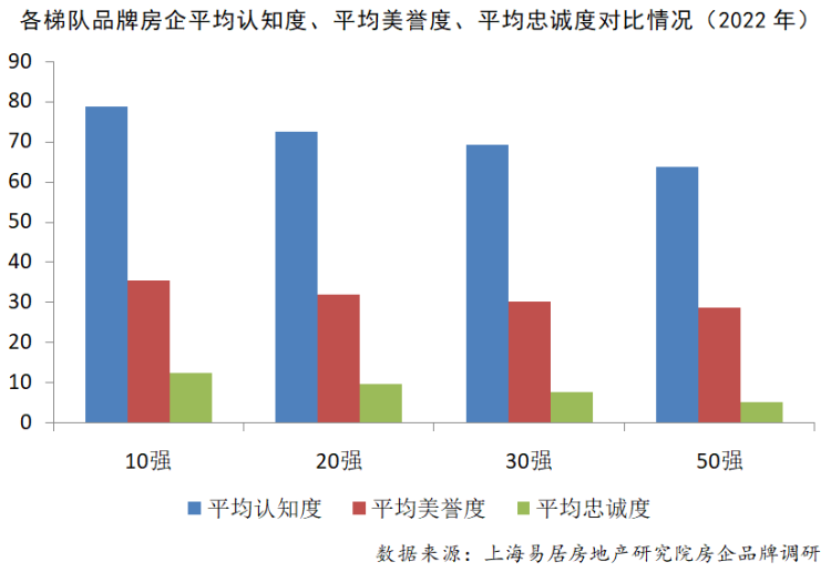 通过连续三年消费者调研,从认知度、美誉度和忠诚度三个维度分析房企的品牌特征。总体来看,2022年,50强品牌房企的认知度有所提升,美誉度和忠诚度则出现不同程度的下降。其中,平均认知度为45.26%,较上年上升1.77个百分点,各梯队认知度均较上年有所提升;平均美誉度为29.43%,较上年下降5.07个百分点;平均忠诚度为5.07%,较上年下降2.86个百分点。从分化程度看,各梯队品牌房企认知度分化程度较小,方差较上年有所缩小,为1.01%;美誉度和忠诚度方面分化加大,方差分别为4.83%、0.45%。尤其是10强和50强之间在美誉度和忠诚度方面差距继续扩大,其中美誉度均值相差3.43个百分点,忠诚度均值相差7.28个百分点。