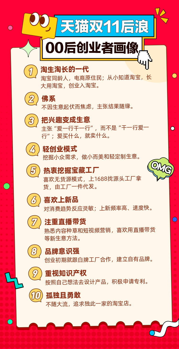 数据显示,00后商家有一些共同特征:把兴趣变成生意,想买什么就卖什么,爱一行就干一行;挖掘小众需求,做小而美和轻定制生意;热衷于挖掘宝藏工厂,上1688找源头工厂拿货,由工厂一件代发;上新品频率高、速度快;自有品牌和知识产权意识非常强。