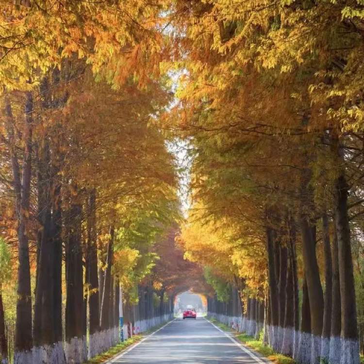 从空中俯瞰的视角你见过吗?水杉叶在地上铺了厚厚一层,漫漫金黄色顺着公路延伸;放眼望去,这里好似正奔腾着生命的律动。