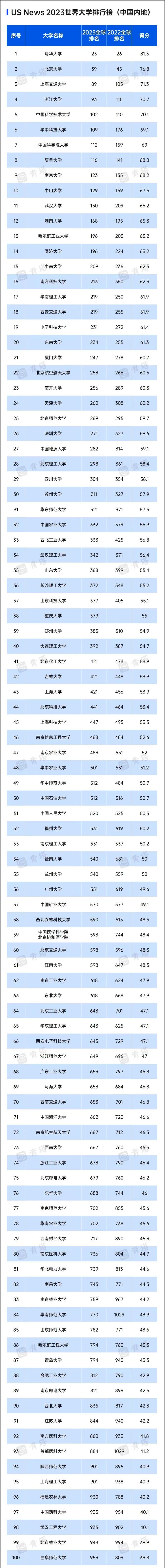 一年一度的USNews世界大学排行榜正式发布,涉及95个国家,47个学术专业领域。清华亚洲第一,北大冲进全球前40,中国内地大学创历史最好成绩。上海交通大学和浙江大学都冲进了全球前100,分别位列第89和93位,这是历史首次除清北外的内地学校入榜。复旦大学位列116名,比去年进步了25名。