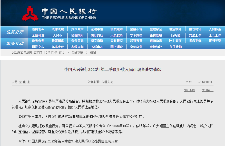 央行:拒收人民币现金,两物业公司被罚 周到君 2022-10-27 来源:周到上海 10月27日,中国人民银行官网公布了2022年第三季度拒收人民币现金处罚情况,两物业公司及相关责任人被处以经济处罚。 人民银行表示,坚持宣传引导与严肃惩治相结合,持续推进整治拒收人民币现金工作。对核实为拒收人民币现金的,人民银行依法处罚并予以曝光,切实保护消费者的合法权益,维护人民币法定地位。 第三季度,人民银行依法对2家拒收现金的物业公司及相关责任人作出经济处罚。 人民银行表示,社会公众遇到拒收现金行为,可依据《中国人民银行公告》(2020年第18号),依法维权。广大经营主体应强化法治观念、维护人民币法定地位,诚信经营、尊重公众支付选择权,共同打造现金和谐流通环境。 拒收人民币现金处罚信息表 来源:周到上海 作者:周到君 赞一个 (0)