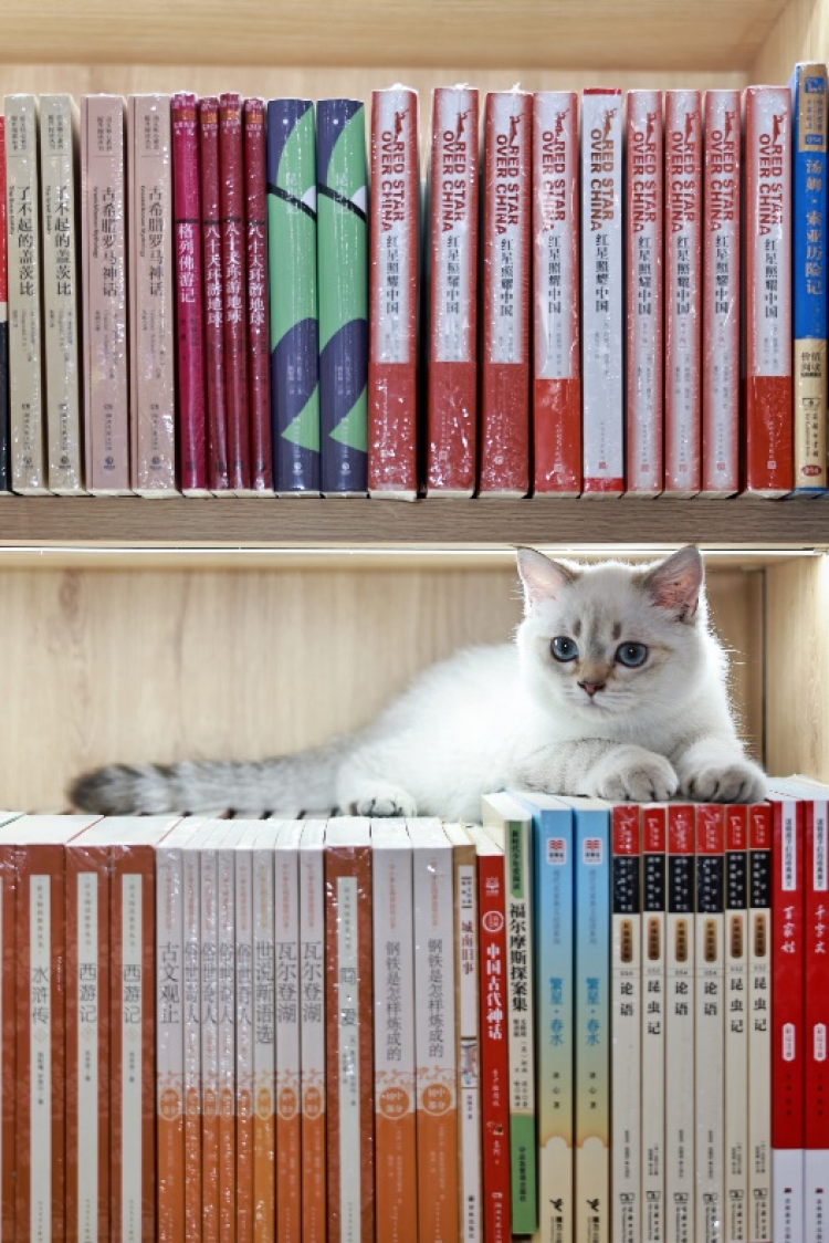 ▲新华书店宠物主题书店“聘请”猫咪店员,陪伴读者阅读。(摄影:李悦)