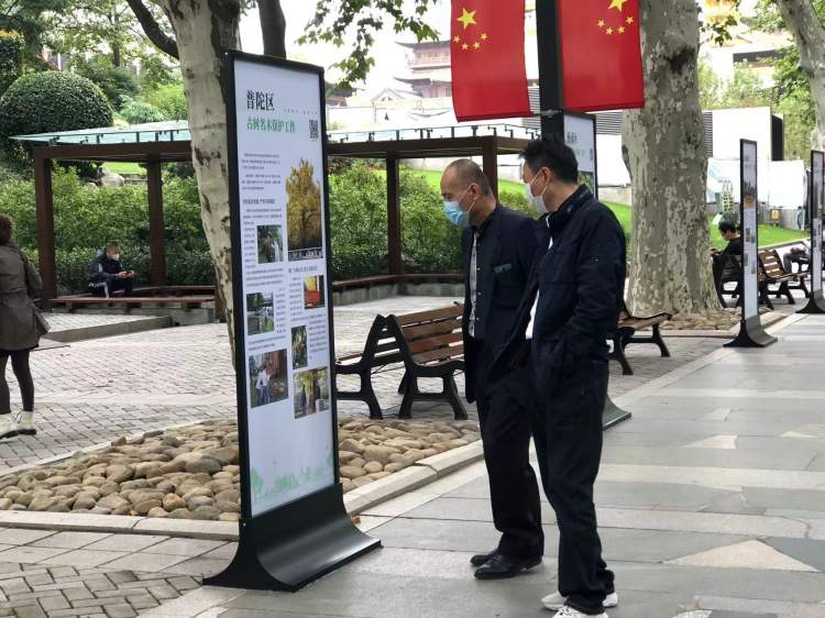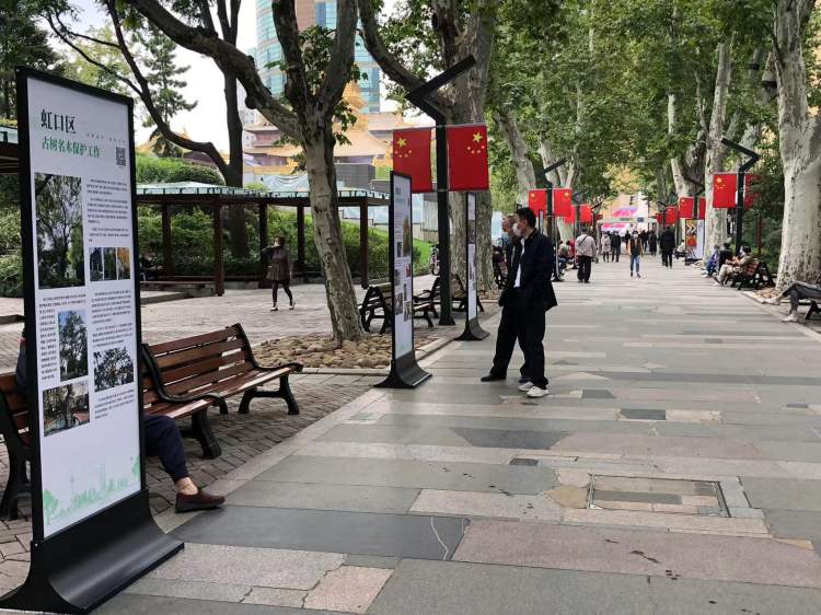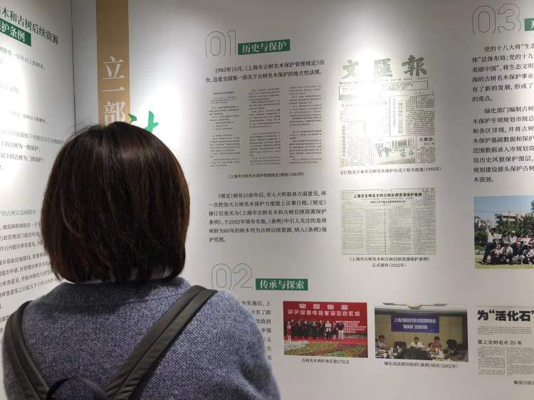 记者在现场看到,室外展区,不少市民在静安公园悬铃木古树群下驻足,观看展板,了解古树保护的故事。这两排悬铃木其实是上海古树保护案例的“活教材”。