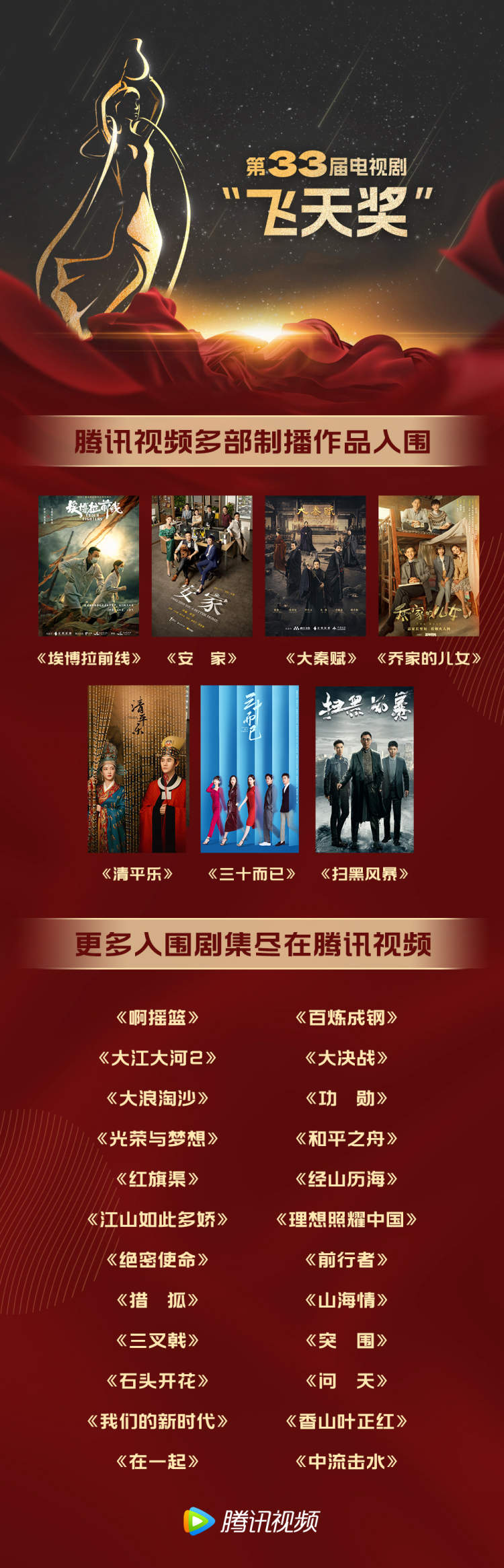 此外,腾讯视频近年来也不断加大对主流内容的覆盖力度和投入力度,除了上述优秀作品之外,入围名单中的《啊摇篮》《百炼成钢》《大江大河2》《山海情》《在一起》《理想照耀中国》《大决战》《大浪淘沙》《功勋》《光荣与梦想》等多部佳作也都在腾讯视频播出,并取得了不错的播出效果。未来,腾讯视频将继续坚守精品内容创作路线,注重优秀影视作品的开发、制作和排播,讲好中国故事、传播中华文化,以更优质的内容回馈观众和社会。
