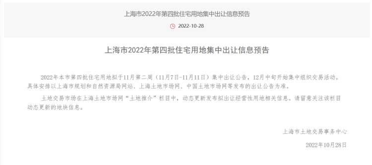 2022年第四批住宅用地集中出让将于12月中旬举行 张自达 2022-10-28 来源:周到上海 10月28日,据上海土地市场发布公告称,上海市2022年第四批住宅用地集中出让将于12月中旬开始集中组织交易活动,预告全文如下: 获得更多购房资讯,欢迎扫描下方二维码,关注地产新空微信公众号,或加入地产新空“房友俱乐部”讨论区。 来源:周到上海 作者:张自达 赞一个 (0)