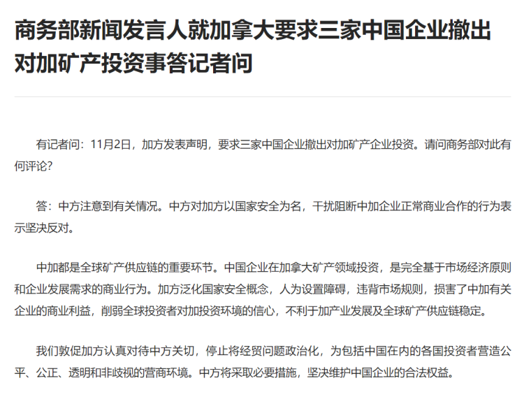 有记者问:11月2日,加方发表声明,要求三家中国企业撤出对加矿产企业投资。请问商务部对此有何评论?