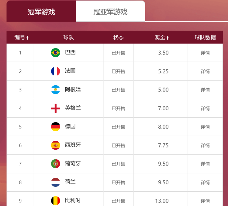 冠军竞猜游戏,顾名思义,即竞猜本届世界杯最终赢得大力神杯的球队,作为最后一届拥有32支决赛圈参赛队的世界杯(下届将扩军至48队),本次冠军竞猜设置了32个结果选项,购彩者可选择心仪球队进行投注,所有选项均设置固定奖金。