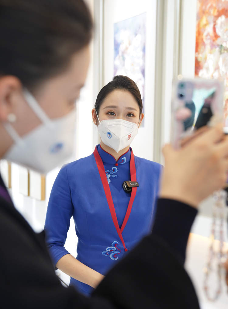 11月7日下午,四叶草4.2馆内的艺术精品展区吸引了不少嘉宾驻足参观,刚刚那段关于宋代汝窑莲花温碗唯美的讲解,来自于东航“凌燕”礼仪志愿服务队的讲解员唐琪。作为进博会五年级生,这是她第三次参与讲解工作。