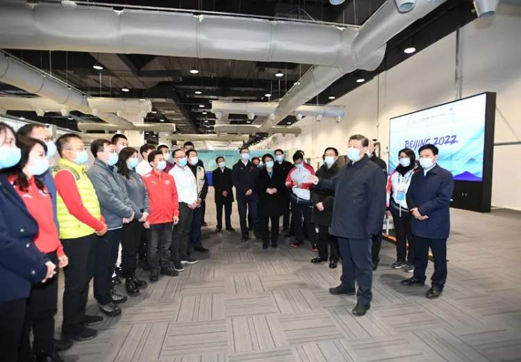 2022年1月4日,习近平在北京考察2022年冬奥会、冬残奥会筹办备赛工作。这是4日上午,习近平在北京冬奥会、冬残奥会主媒体中心媒体工作间,同正在做准备的国内媒体记者代表亲切交流。新华社记者谢环驰摄