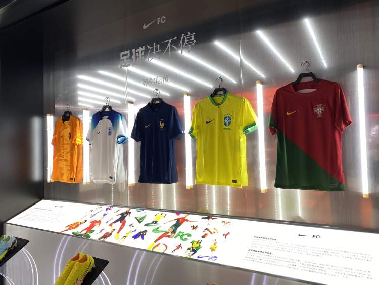 即使是在需要高科技加持的竞技体育领域,耐克也是兼顾了“可持续创新”。就像这次展出的2022年卡塔尔世界杯巴西、英格兰等队的比赛球衣,就是采用了Dri-Fit ADV创新技术并由100%可再生聚酯纤维制成。再一次证明了即便是高性能装备,也可以使用再生材料的事实。