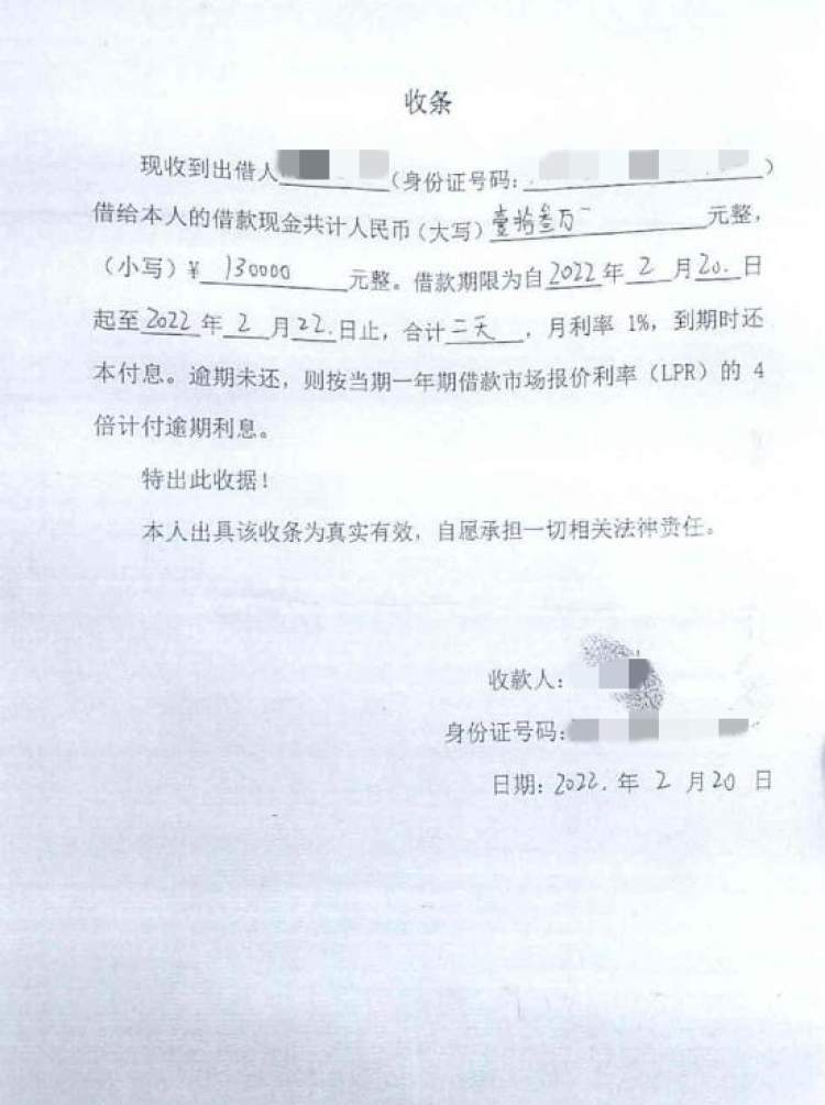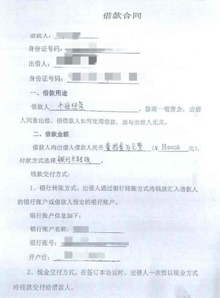 张先生见王某穿着阔气,出行皆为豪车,便打消了疑虑,觉得这笔“生意”靠谱。两人协商一致后,就去了酒店附近的打印店打印普通借款合同并签字画押,张先生便将13万元转给了王某提供的指定账户。